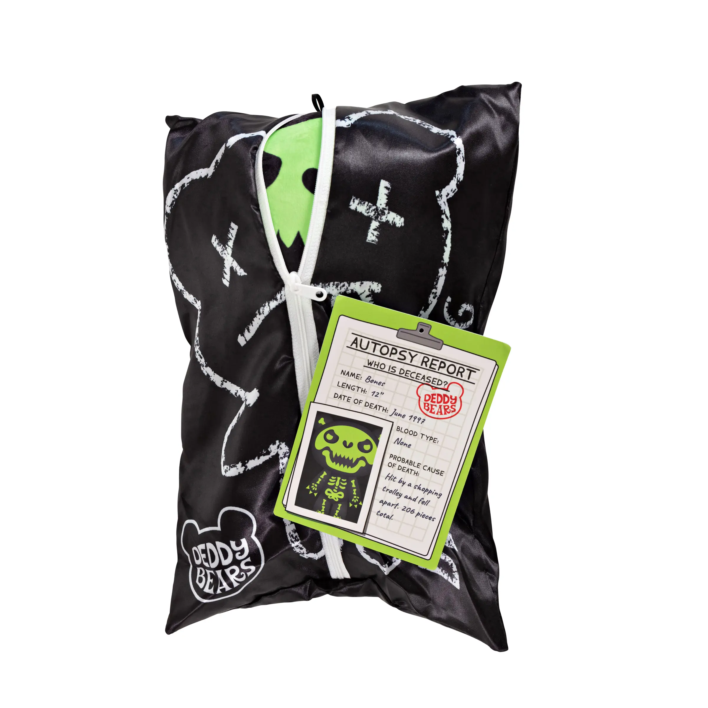 Meet BONES! A delightfully spooky character from Deddy Bears, Series 1! Bones features velvety smooth, black fur with fluro green skeletal motifs, depicting a bears skeleton x-ray, and hollow, haunting eyes. This Deddy Bear was unfortunately struck by a shopping trolley, resulting in a total of 206 bone fragments!