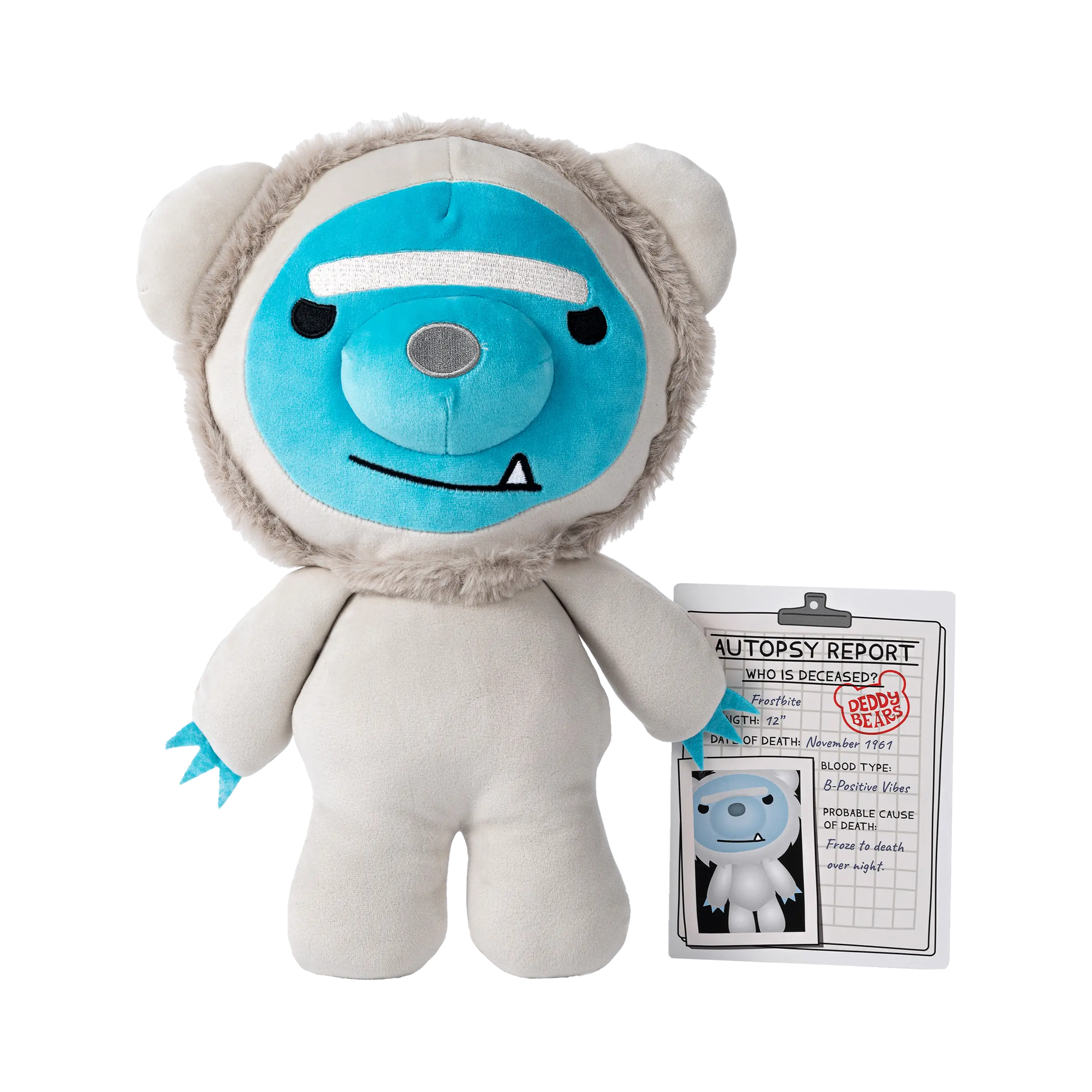 Introducing FROSTBITE! The chillingly adorable character from the Deddy Bears Series 2! This frosty, blue-faced plush bear features an icy-white fur coat, embroidered details, with hauntingly cute eyes, and blue claws.